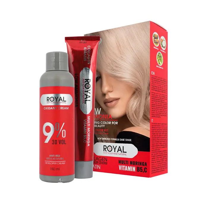 این کیت شامل 2 محصول است که یک تیوپ رنگ مو و یک اکسیدان به همراه کلاه، دستکش و قلمموی رنگ میباشد – پکیجی کامل برای اجرای بینقص در خانه یا سالن.