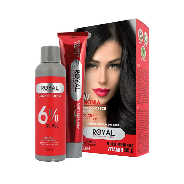 این کیت شامل 2 محصول است که یک تیوپ رنگ مو و یک اکسیدان به همراه کلاه، دستکش و قلمموی رنگ میباشد – پکیجی کامل برای اجرای بینقص در خانه یا سالن.
