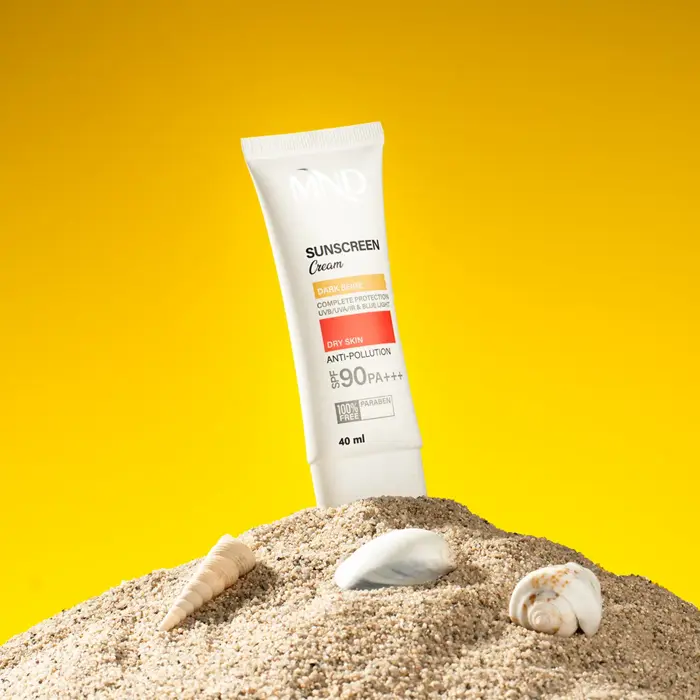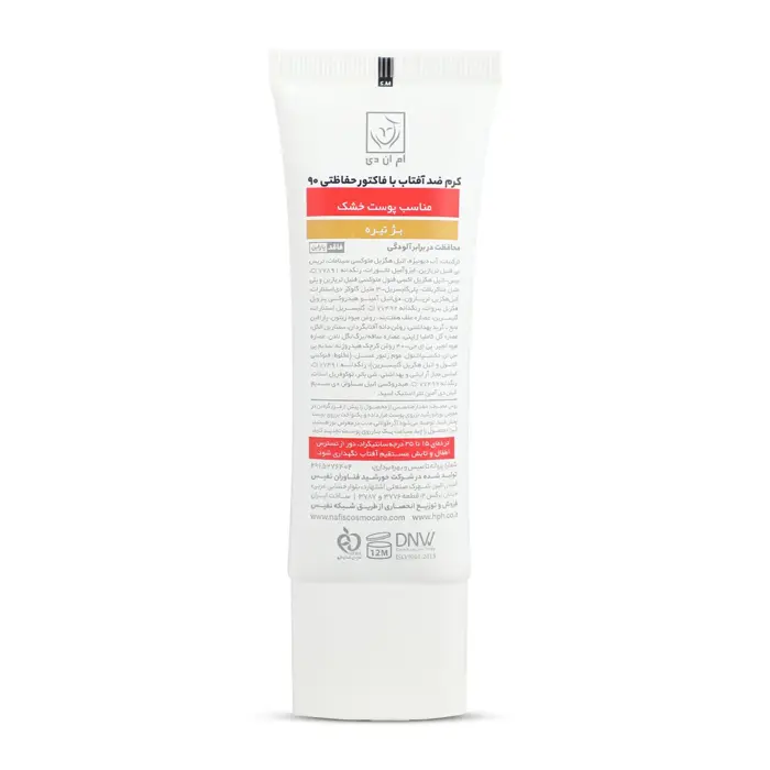 تابش طولانی مدت نور خورشید، یکی از عوامل تسریعکننده پیری زودرس پوست است. اشعههای UVA و UVB خورشید با ایجاد رادیکالهای آزاد، به ساختارهای حیاتی پوست آسیب رسانده و موجب تسریع روند ایجاد لک و چین و چروک میشوند. تحقیقات علمی اخیر همچنین نشان دادهاند که طیف مادون قرمز ساطع شده از خورشید و نور آبی منتشر شده از لوازم الکترونیکی (رایانه، گوشی همراه و...) نیز در آسیبرسانی به پوست نقش دارند. در نتیجه، برای تولید یک محصول ضدآفتاب کامل، مقابله با این اشعهها نیز باید مورد توجه قرار بگیرد. این کرم ضدآفتاب ام ان دی با فاکتور حفاظتی 90، به رنگ بژ تیره و مناسب برای پوست خشک تولید شده است. این محصول فاقد پارابن بوده و با بهرهگیری از ترکیبات و فیلترهای مناسب، قادر است مانع از صدمه دیدن پوست توسط اشعههای فوقالذکر شود.